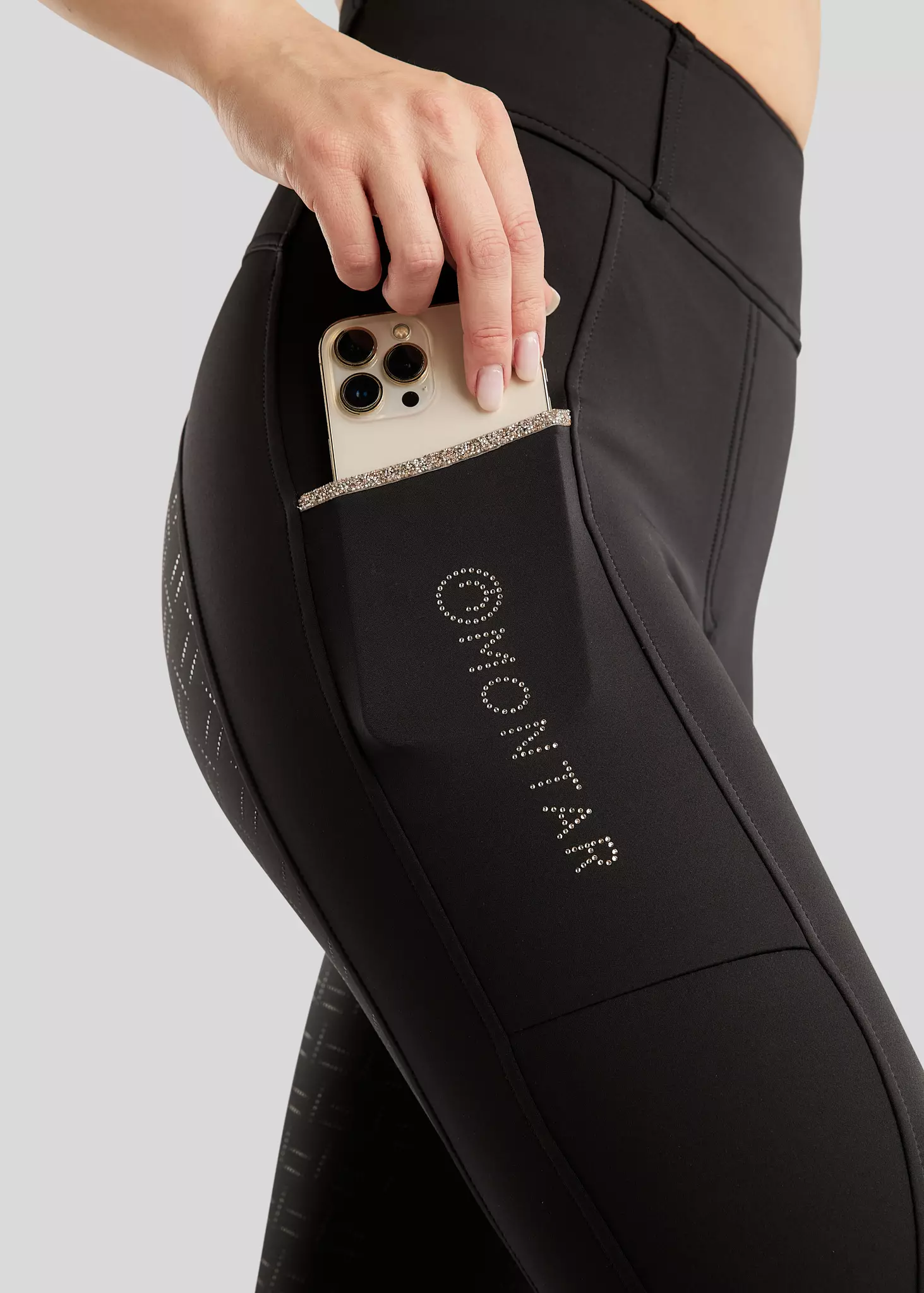 Tyylikkäät Montar ratsastusleggingsit shampanjan värisillä kristalli yksityiskohdilla