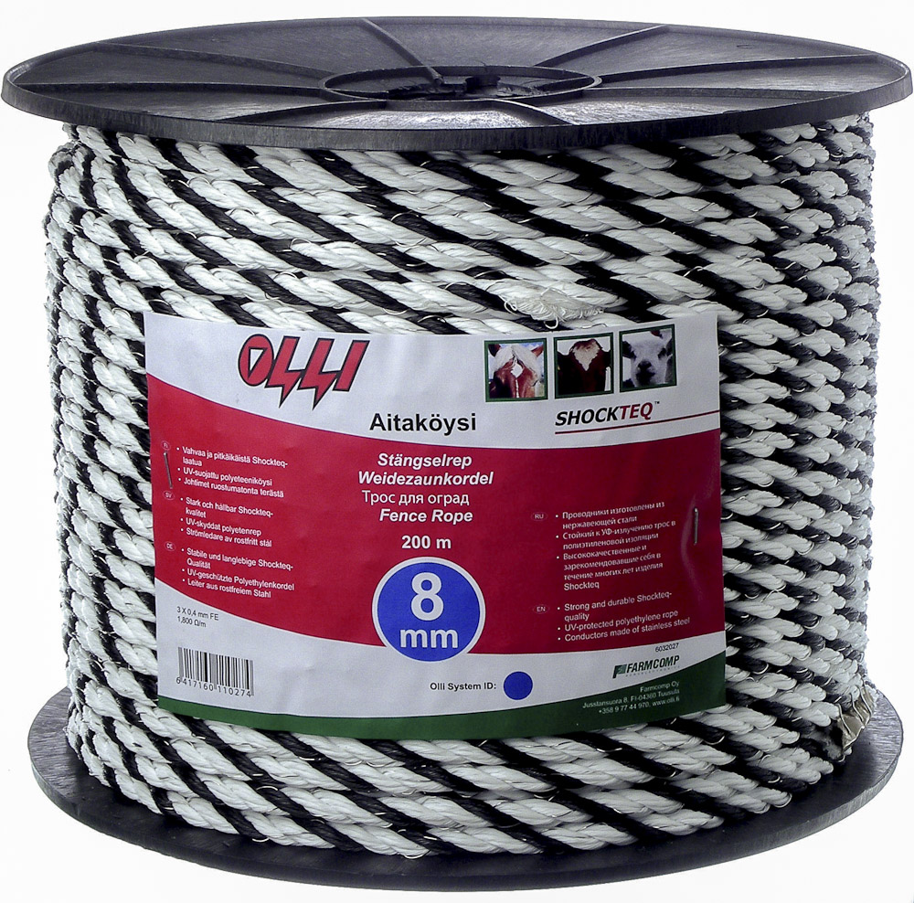 Svart-vit el-rep 8 mm diameter. - 3x 0,4 mm ledare i rostfritt stål för bästa styrka och livslängd - UV-behandlat för att tåla solens strålar / 5 års garanti - 200 m/spole - 1,6 ohm/m.... Läs mer